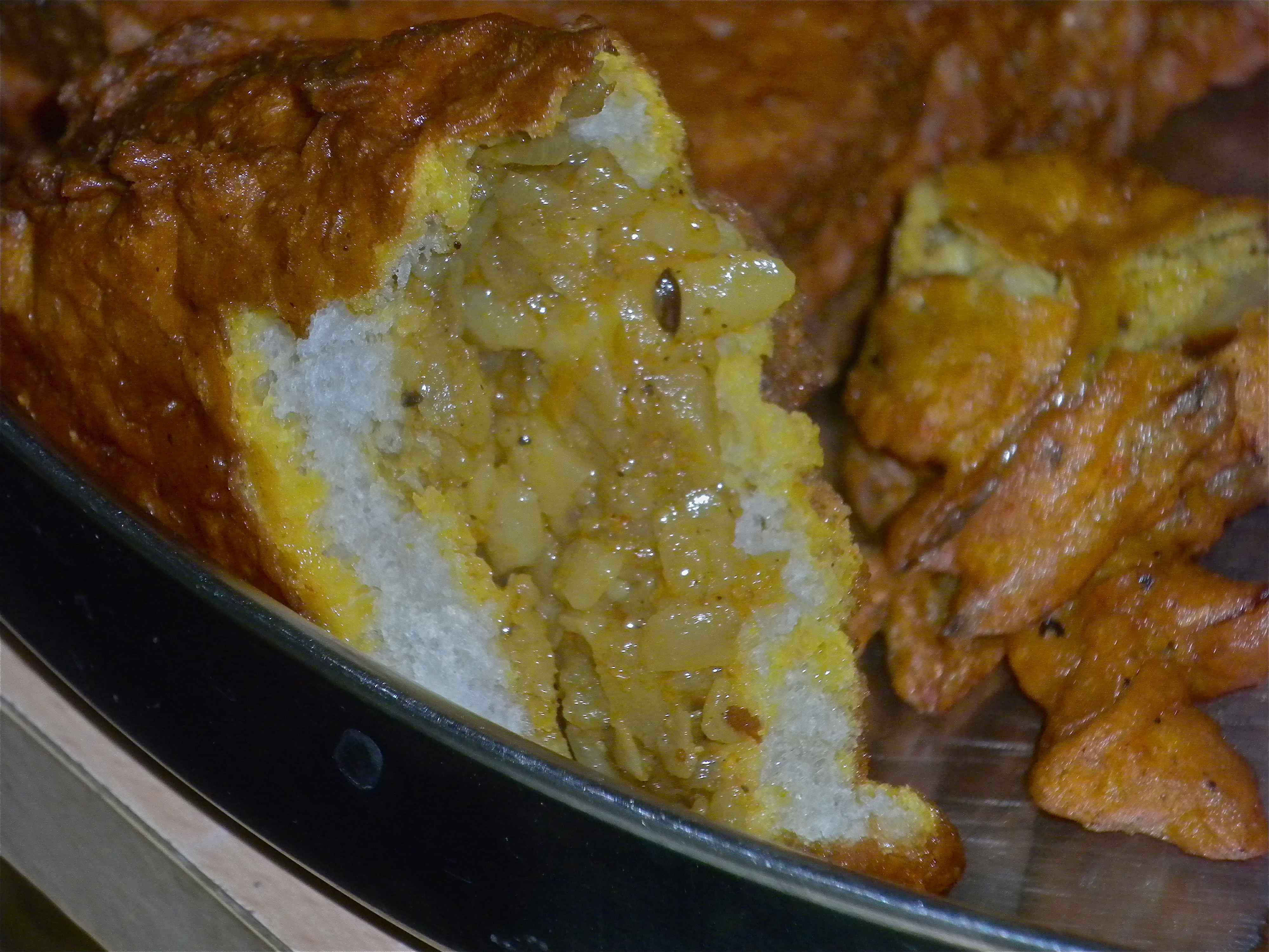 This my friends is a mashed, cumin and chili spiced potato mixture spread between a folded up piece of Wonderbread, dipped in pakora batter and deep fried to a brown, crispy goodness.