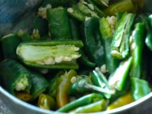 Add a single layer of eggplant and chile pieces to the pot carefully, turning over with a slotted spatula or metal spoon after about 3 to 4 minutes and cooking both sides until they are golden brown. Be careful not to add to many pieces (more than 8 to 10 at a time is too much) because it will cool the oil too rapidly. When the pieces are deeply golden (see photo below) lift out of oil and drain pieces on a cookie sheet lined or in a large bowl, either lined with newspaper. Keep warm in a very low oven. Repeat the batter/frying process until you work your way through all off the eggplant and chile. If you have any leftover batter, you can drizzle it slowly into the remaining hot oil and fry until golden brown – you will never want potato chips again!