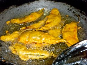 Meanwhile, in a large bowl combined the chile powder thru besan flour and stir with a fork or your hands. Slowly mix in water to the flour mixture, starting with about 3/4 cup and adding slowly until you get a batter that is similar to a pancake batter and there are no lumps of flour remaining. Drop in about half of the chiles and the eggplant mixing gently with your hands to completely coat both ingredients. At this point check to see that the oil is hot enough to start cooking – you can test this by carefully adding just a drop of batter to the oil. If it starts to sputter and sizzle, you’re in business.