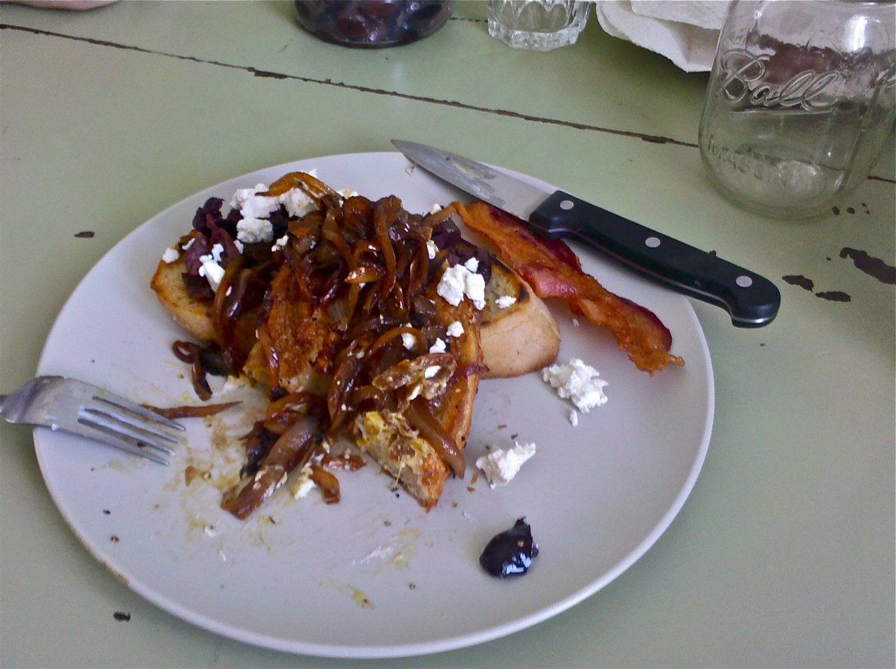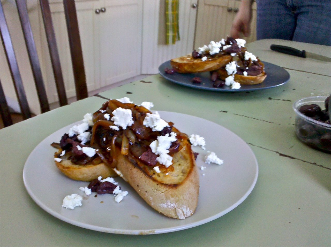 To serve sprinkle onions, goat cheese and olives evenly among the four plates and get your hands out of the way before you are speared with the fork of your hungry companion.