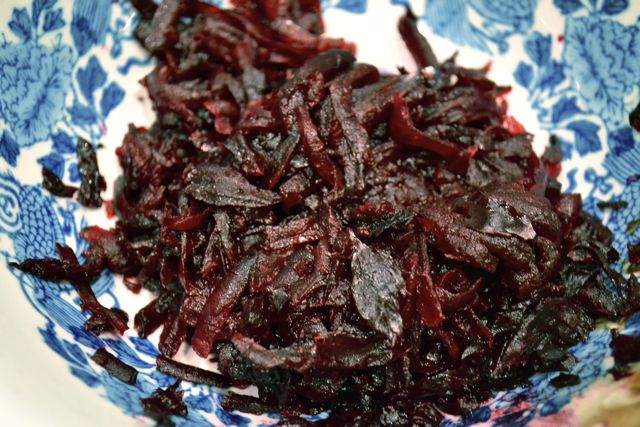 Boil the beets in salted water with the lid askew until they’re very tender when you stick a knife in them about 45 minutes. Drain then rinse the beets with cold water. When cool enough to handle, slip off the peels, cut the beets into chunks, and grind them in a food processor until you get a coarse, yet cohesive, puree. (If you don’t have a food processor, use a cheese grater.)