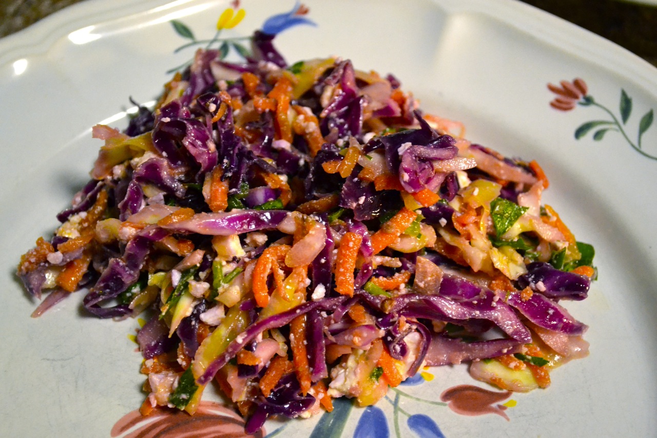 I have never understood why coleslaw is considered a “summer” dish. As with the other quintessential “summer” side dish, potato salad, all of the ingredients are at their prime in the winter and are basically the only ingredients you can get at farmers markets from December thru March. In this version I use green and red cabbage as well as shredded carrot and the result is stunning – like little slivers of vegetable jewels. This salad also packs a serious crunch punch, as everything is raw and provides a refreshing break from stews and slow-cooker meals (not that I am knocking them. I ❤ my slow cooker). This salad is great on its own with a handful of chickpeas or as a side for a simple grilled chicken breast or as a topping for a BBQ pork taco. The possibilities are endless. Enjoy!