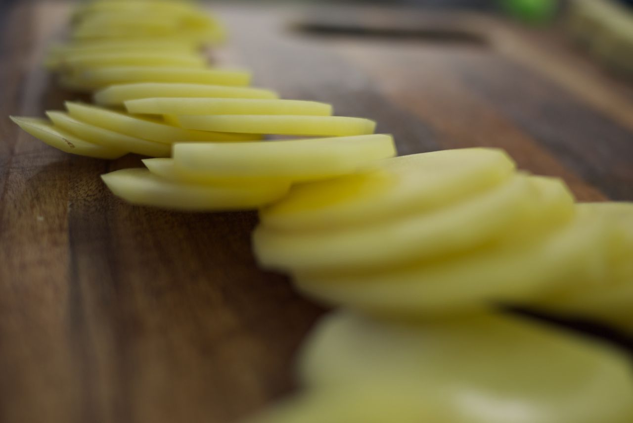 Equipment used: Oxo mandolin on setting 3, stainless steel pans