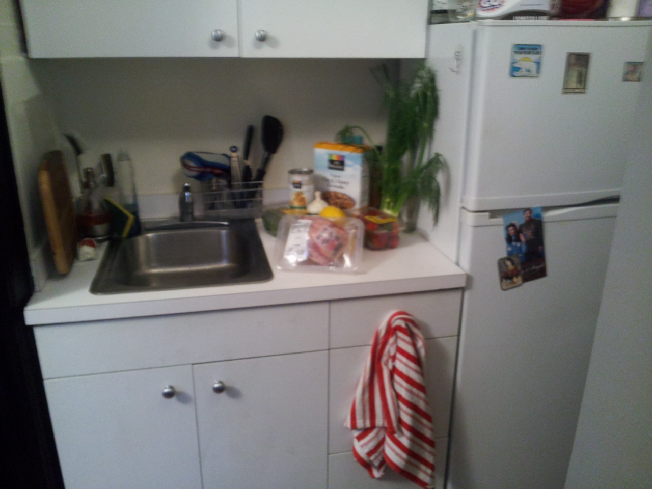 Or lack thereof. Stretch out one arm and take note of the distance from your shoulder to your fingertips. That is how big my kitchen counter space is, including the sink. I have a small gas stove at the opposite end of the apartment and a small refrigerator unit on the right side, making my right-handed knife wielding clumsy and in-accurate. This is New York studio living at its best. But it’s all I got, so here we go.