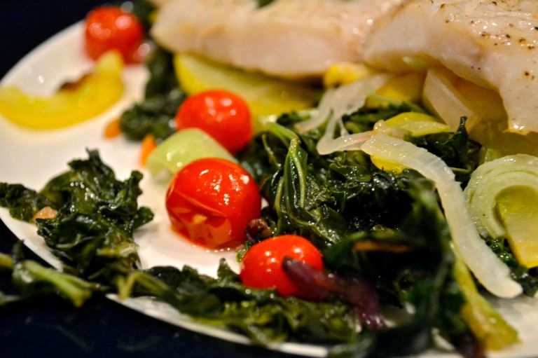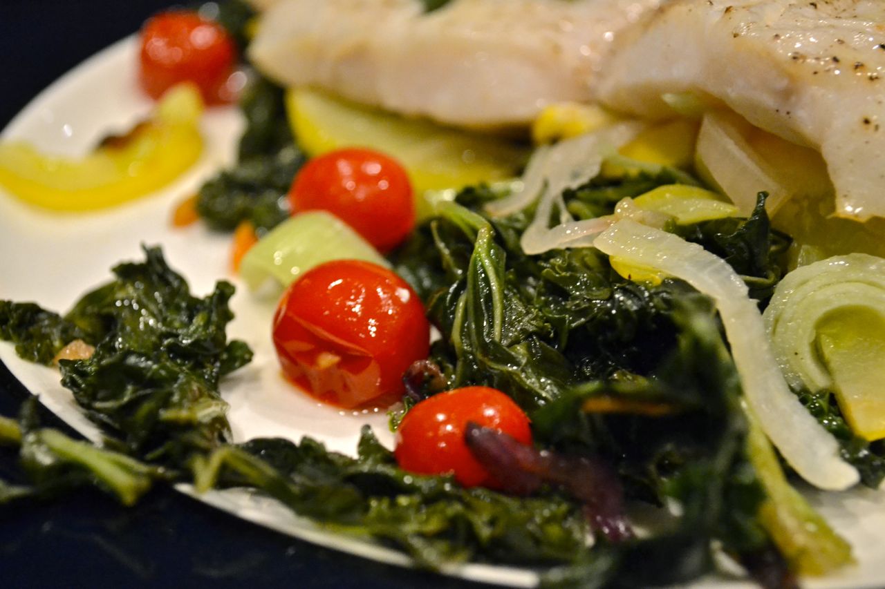 En Papillote cooking allows whatever you are cooking – in this case fish and tomatoes – to cook in their own natural juices and aromas with a few added flavors. All the flavors of the ingredients are heightened and once the process is finished, you already have a light sauce at the bottom of the bag to pour over your halibut. I like this method because it’s kind of like crafts in the kitchen with all the cutting and folding and crimping. This meal would also serve you well after a heavy barbecue or picnic to restore the vitals.