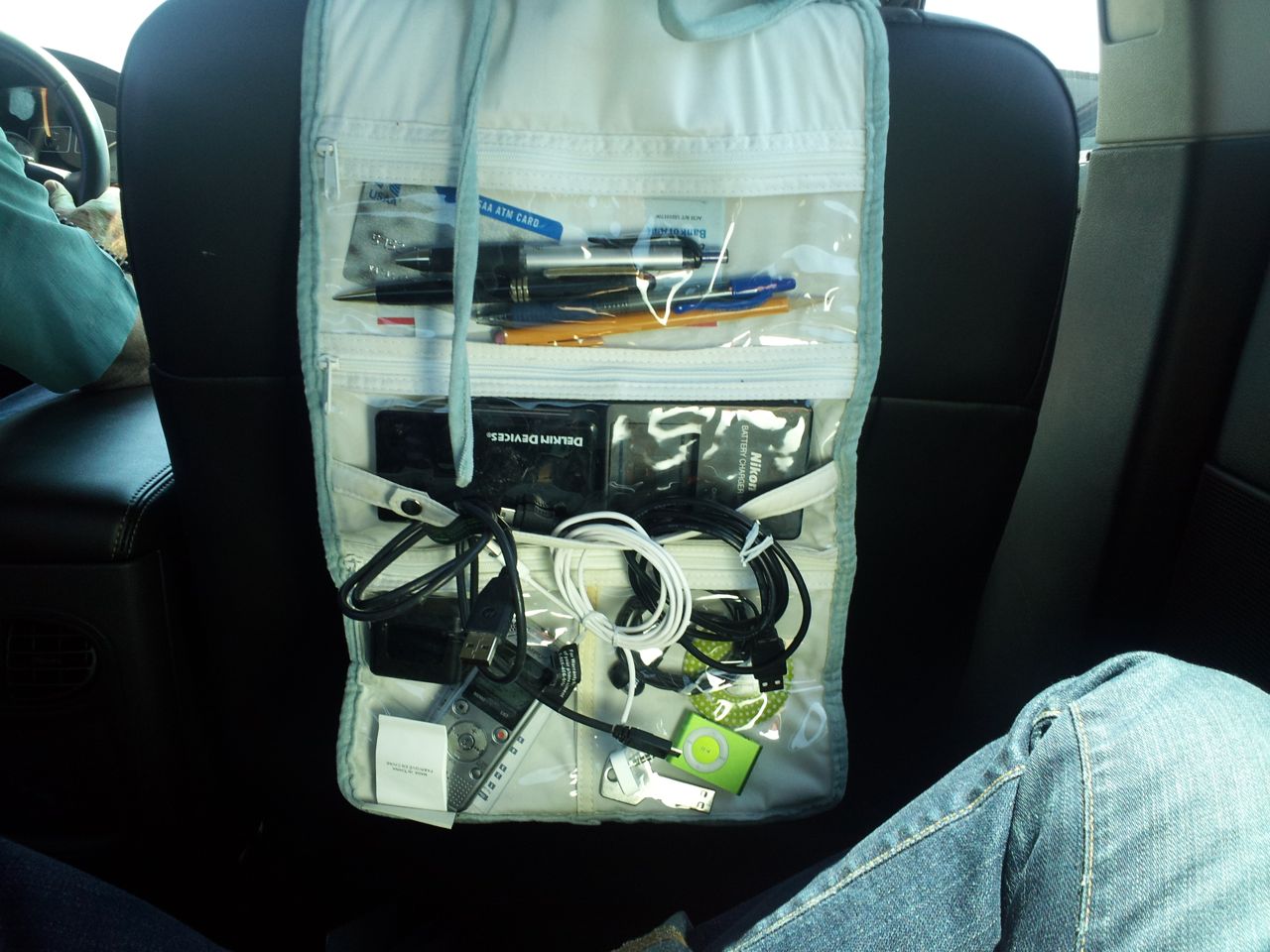 You see? Now I have all my things like media card readers and iPod cables close to me; the backseat is now my own personal office. I can’t wait to try it on the airplane to Guate.