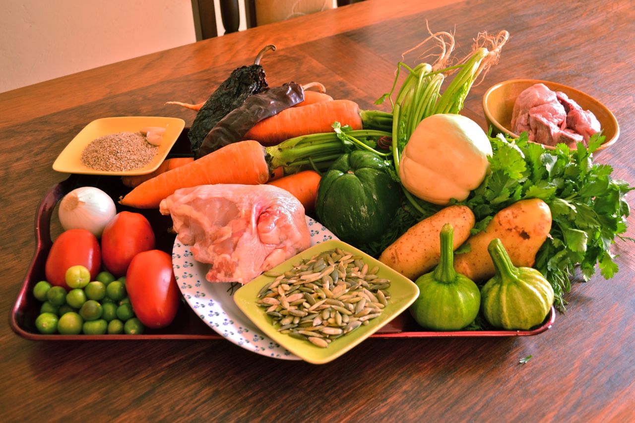 And then there are the times when I get to be in the kitchen with others, in the flesh. Sometimes it’s with Pasquala, the housekeeper in at the San Juan house who made an attempt to teach me how to make tortillas at which I failed miserably but enjoyed immensely. Other on Sundays in Senora Hilda’s when everyone – me, the German kids, Hilda, Hilda’s husband Mageo, her niece, her grandson, and the kitchen help – crams into the kitchen to make pizza or sample a special dish from Hilda’s repertoire. In the case of a recent Sunday I was with Carolina in her kitchen making Pepian. Carolina and Hilda (her mother), are both my friends and new culinary sages, guiding me through the peaks and valleys of authentic Guatemalan cuisine. Even though they have not known me for long, they know me. When I eat at Hilda’s table I am peppered with information about the ingredients used in the dishes before me, why she used them, how they can be used other ways, and would I like to go to the market to learn how to buy the best specimens? When I walked into Carolina’s to cook Pepian, she had this beautiful spread ready for me, knowing I would snap a million photos.