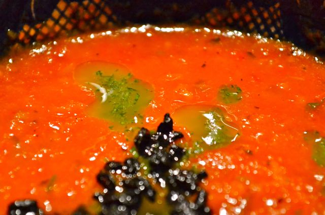 In a large, heavy pot, heat remaining oil over medium-high heat. Add onions, carrots and celery, toss and let fry for five minutes, until they have some color. Add the garlic cloves, bay leaf, tomatoes and peppers (no need to cut them all, you’ll be blending the soup). Saute for another two to three minutes. Add bouillon and water until the vegetables are just covered. Simmer for 15 minutes, or until the carrots and celery are very soft. Remove from heat, add citrus juice and let cool for ten minutes.
