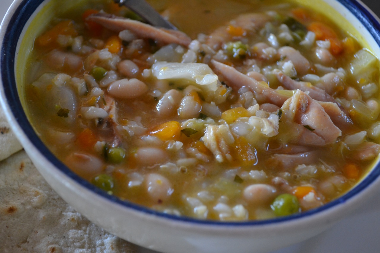 I suspect this would be an amazing dish in the crock pot. Just throw everything together in the morning and turn on low for 8 hours. When you arrive home from your taxing day in your industrial-size kitchen smelling of sweat and butter and stove (is that just me??) remove chicken bones, pull the chicken apart and add back to the soup with mint. Serve. If anyone tries this, let me know. Because I cannot eat a meal without tortillas, that is what I served this with. However, crusty bread works as well. Enjoy! Active time: 15 minutes, Cook time: 55 minutes; Serves 8.