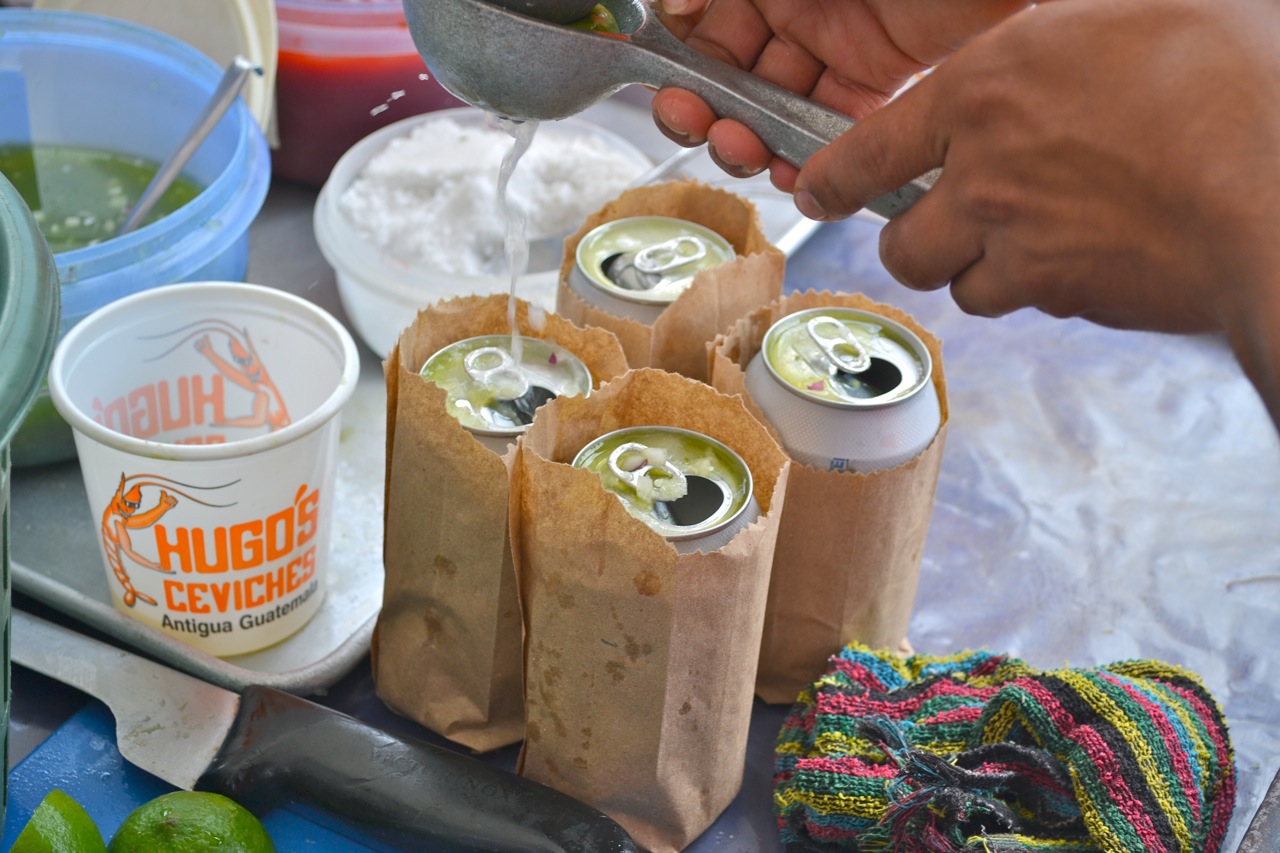 Now, a picocita is a another one of those fun beer-combined-with-other-ingredients combo, like a chelada or a michelada, but better. It starts with a beer, usually Gallo Draft, which is produced in Guatemala but sold dirt cheap in Mexico. I have heard that to obtain it in Guatemala, one usually needs to import it illegally… Anyhow, you start with a Gallo Draft in a small paper bag. The bartender/ceviche slinger will ask you to take a few sips before the magic begins. Then you hand your Gallo back, he lines them up and fills them with ingredients in this order – a spoonful of salt, a spoonful of chile/chopped onion mix, a generous squeeze of lime, a generous squeeze of Worcestershire sauce and another good dose of lime juice. This concoction is handed back to you, the paper bag wet from collecting condensation from the (normally) ice-cold Gallos, to be enjoyed once again on those plastic stools on the uneven, broken sidewalks of Antigua.