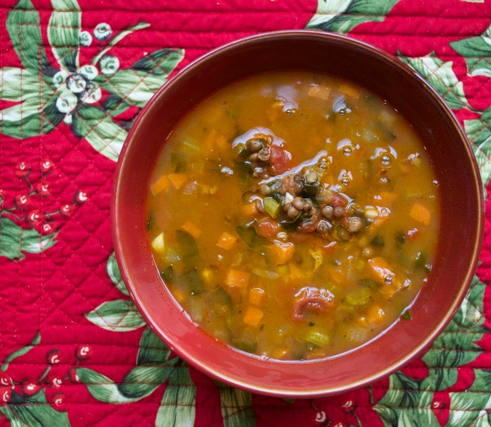 Chorizo and Lentil Soup with Lemon Oil Drizzle and Catching Up